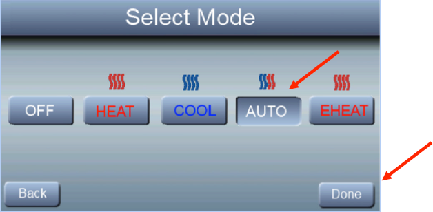 Press AUTO to select the automatic changeover mode. In AUTO Mode the thermostat will choose the correct mode to operate based on the heating and cooling setpoints entered by the user or the program schedule entered by the user.