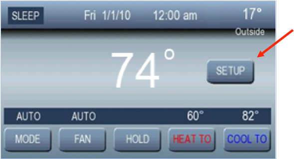 Note: some thermostats may have been user configured with a 4-digit keypad lock. If this is the case, enter the 4-digit code in order to unlock the screen. If you do not know the 4-digit code, the calendar year programmed into the thermostat can be used. For example, if the home screen shows the current date as 7/1/18, enter 2018 as the 4-digit code to unlock the screen.